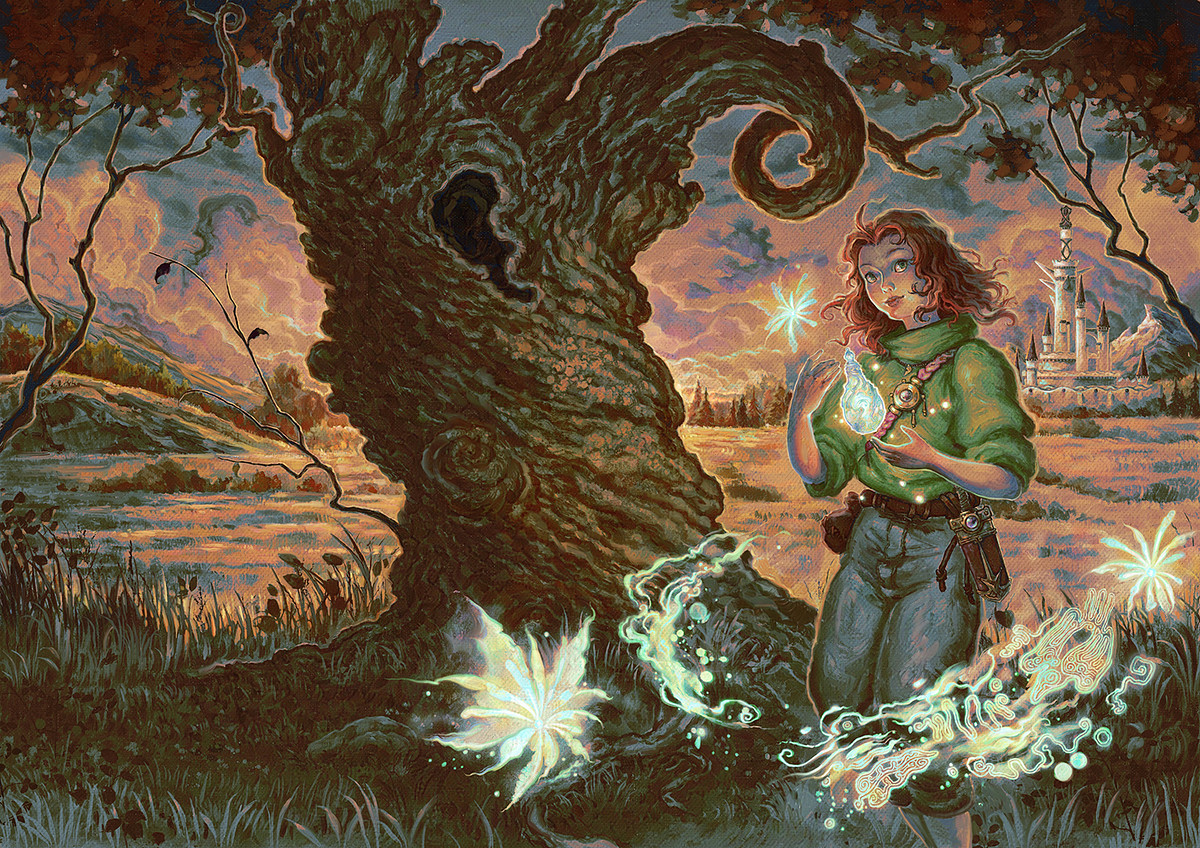 Sensory details like the gnarled bark of a tree, a dreamy pink sky at twilight, and newly cast spells shimmering in the air will help immerse readers in your story. Art by Josh Tufts.